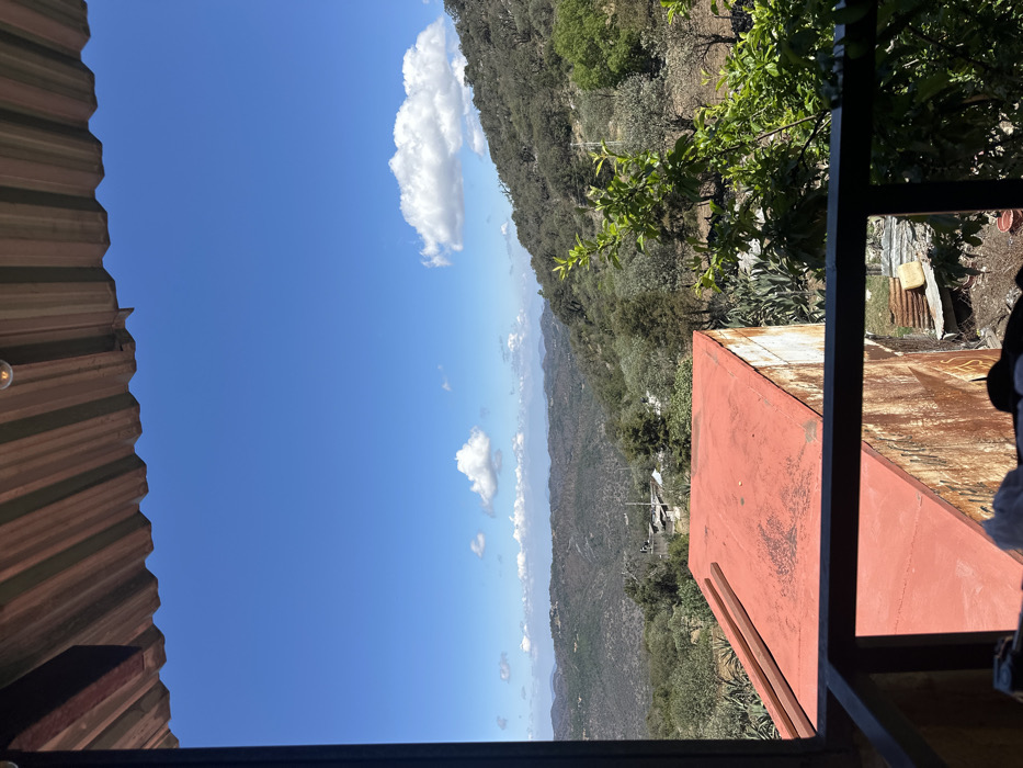 The image displays a panoramic view of a mountainous landscape in El Doctor, Mexico, observed from an elevated, sheltered vantage point