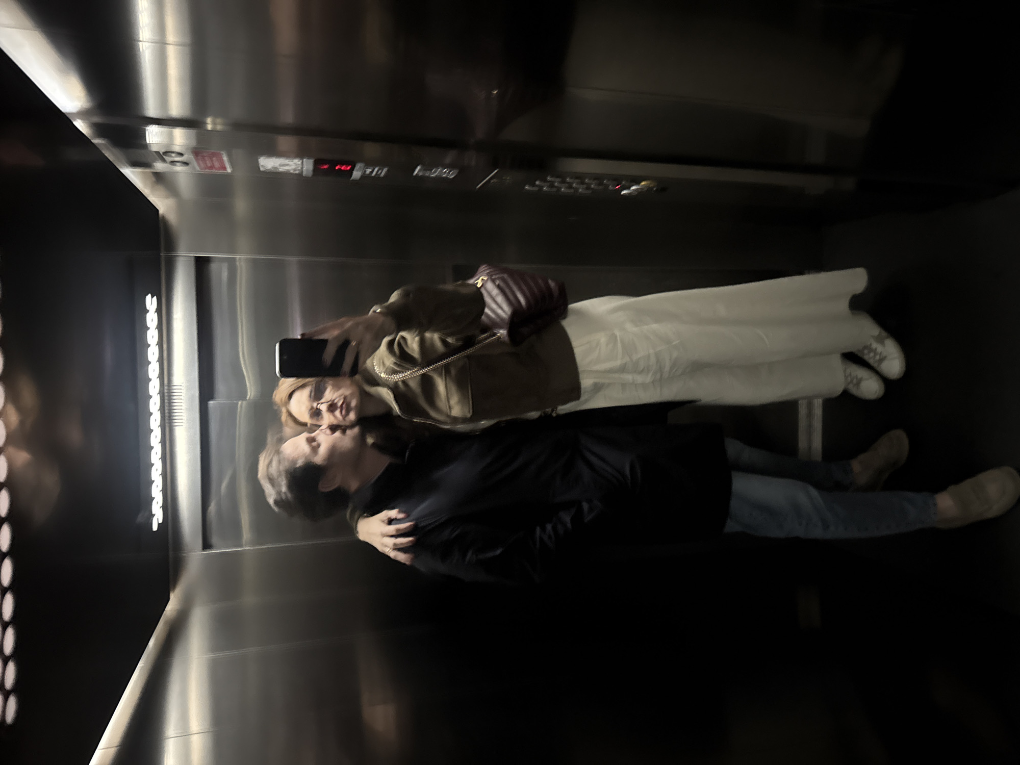 The image captures a selfie reflection inside a brushed metal elevator in Loures, Portugal, featuring two individuals