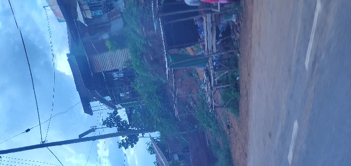 A tilted view shows a roadside scene with a blue-grey asphalt road marked by white lines. A mix of vegetation and dirt form the edge of the road. Buildings are visible behind the trees, with corrugated metal roofing. A makeshift wooden structure with a green sheet hangs. Electrical wires run across the sky, and the sky is a bright blue with white clouds.