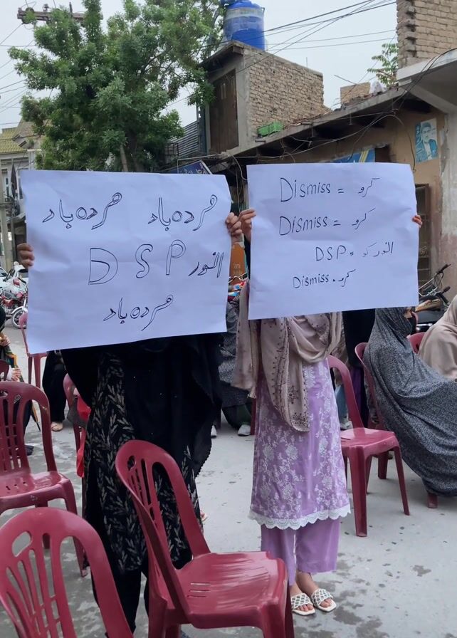 A group of women stand outside holding up signs that demand the dismissal of DSP. The signs read “Dismiss of DSP. Dismiss of” in English and have a similar message in Urdu, written in white on white poster board. Many of the women are sitting on plastic chairs, and are wearing hijabs. The location looks like a residential street.