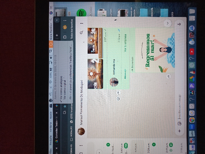 A laptop screen displays a cluttered desktop with multiple applications open. The main window showcases a WhatsApp conversation. Adjacent to it, a file manager window is visible, along with other application icons. The upper left corner displays system information, including the date "Jueves, 8 de enero de 2026, 16:01:13." The overall impression is of a busy digital workspace with a focus on communication through WhatsApp.