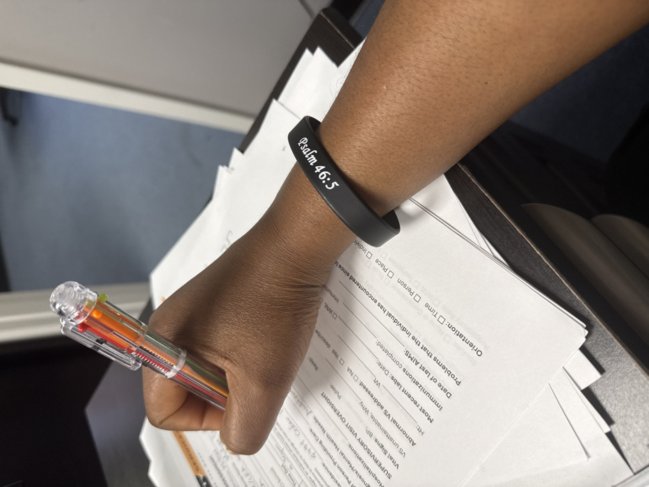 A right hand, with dark skin, is depicted holding a clear multi-color ballpoint pen over a white paper form. The pen, featuring visible red, orange, and green ink cartridges within its transparent barrel, is poised for writing. The form includes printed sections such as 'SUPERVISORY VISIT OVERSIGHT,' 'Vital Signs: BP,' and 'Orientation: Time [] Person [] Place [] Individ,' with partial handwritten text including '4994 Cedar' and 'Andrew.' A black silicone wristband inscribed with 'Psalm 46:5' in white lettering is worn on the forearm. The documents rest on a dark, flat surface within an indoor setting, characterized by a blurred background showing a light-colored wall or door frame. The specific city of Loganville, United States, cannot be visually confirmed from the image content.