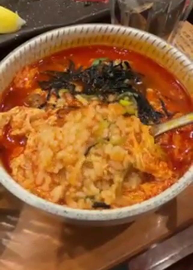 person stirring a bowl of what appears to be a spicy rice soup or congee with a spoon