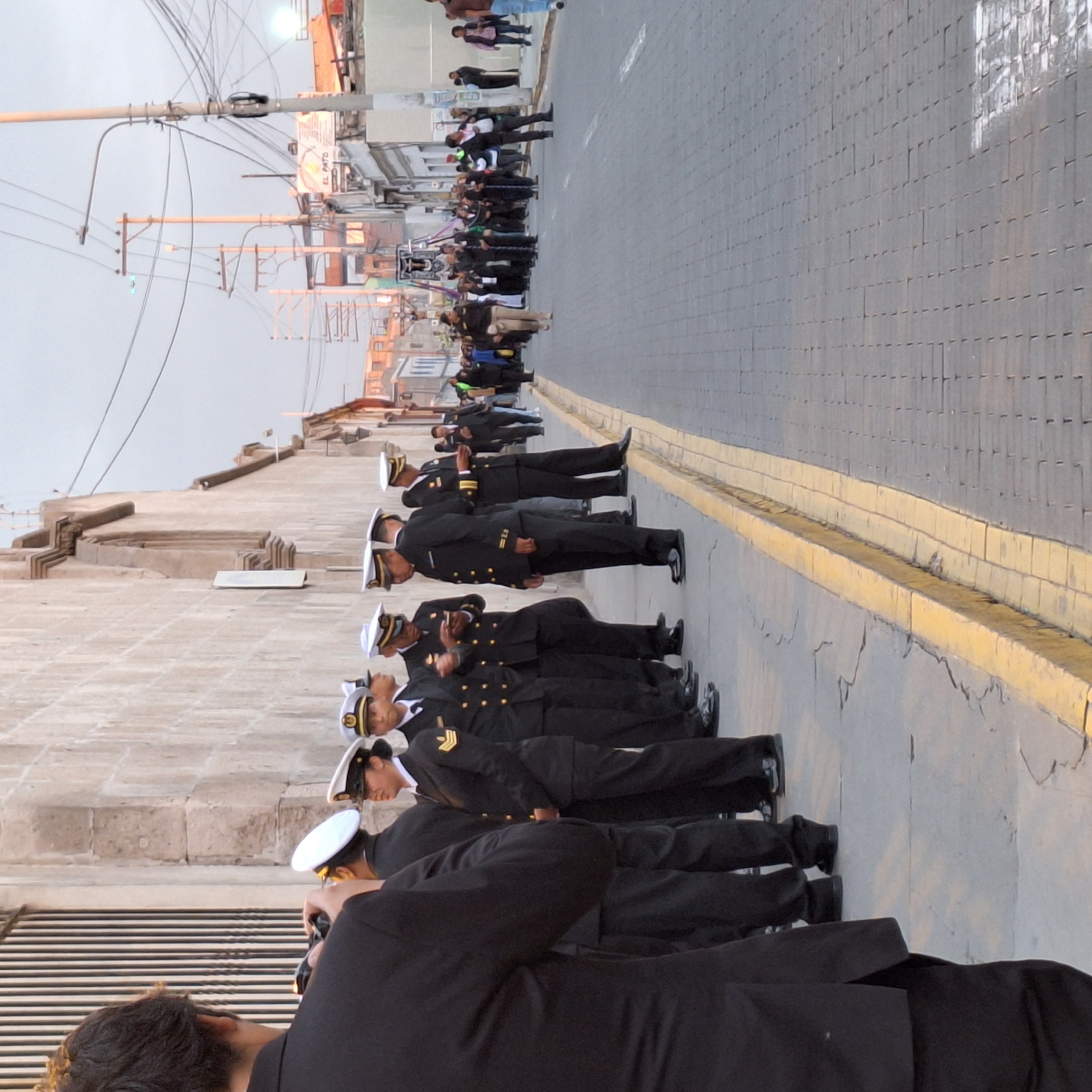 A group of uniformed individuals stands in formation along a paved street in Arequipa, Peru. The scene is dominated by a row of individuals dressed in dark naval uniforms with white hats, positioned along a street with a yellow curb. The formation extends into the distance, where civilians are observing. The backdrop features buildings and utility poles, all indicating an urban setting. The photograph appears to be taken from a low angle. In the foreground, an individual is seen holding what appears to be a camera.