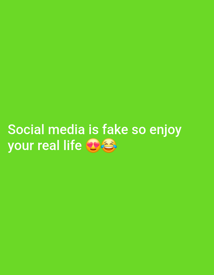 A green background displays the message "Social media is fake so enjoy your real life" in white text