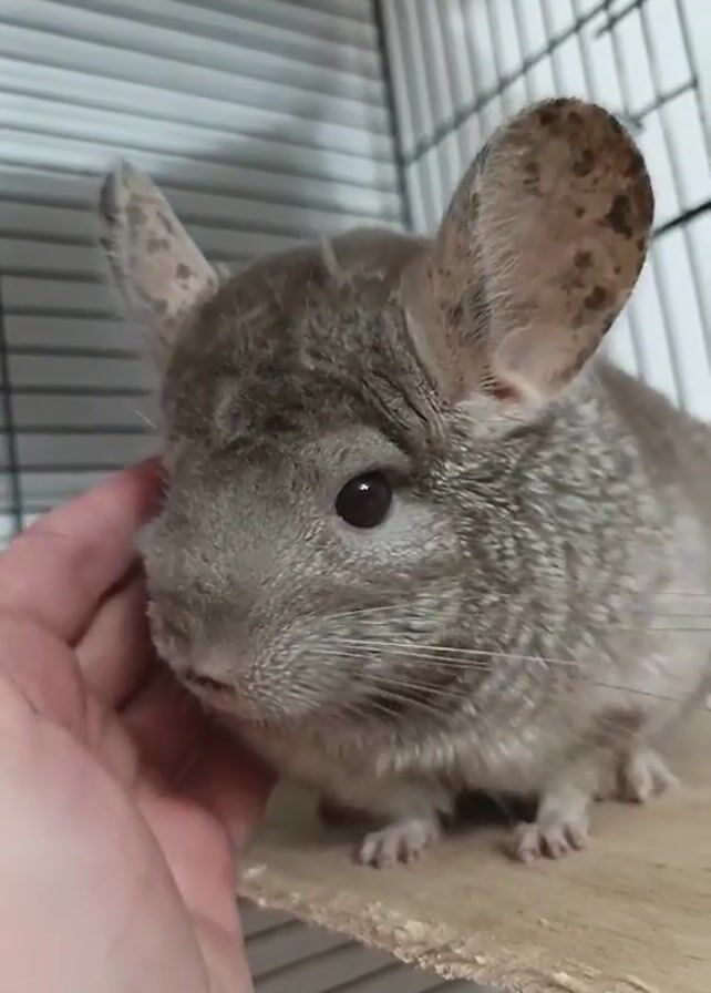 - "A close-up shot shows a gray chinchilla standing on a wooden shelf inside a wire cage" by FM-YVp303, licensed under CC BY 4.0