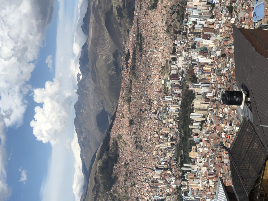 A high-angle view reveals a sprawling cityscape nestled alongside rugged mountains under a partly cloudy sky