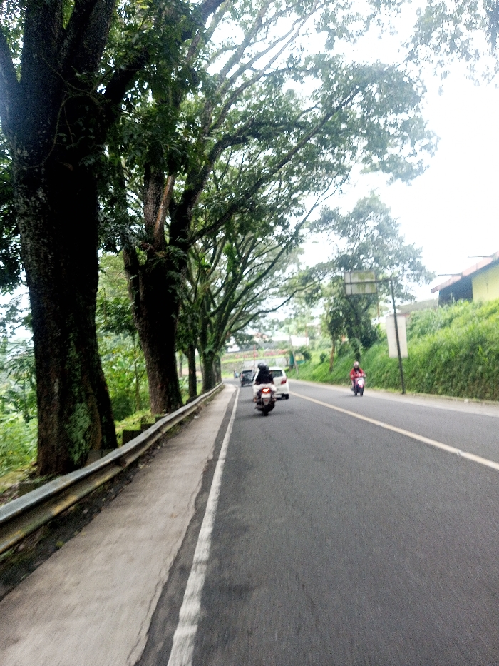 A winding road is lined with tall, dark trees on one side and green foliage on the other. Motorbikes and a car travel along the asphalt. A metal guardrail runs alongside a paved area next to the trees. A double-sided road sign stands near a grassy slope with a building visible at the top. The day appears overcast.