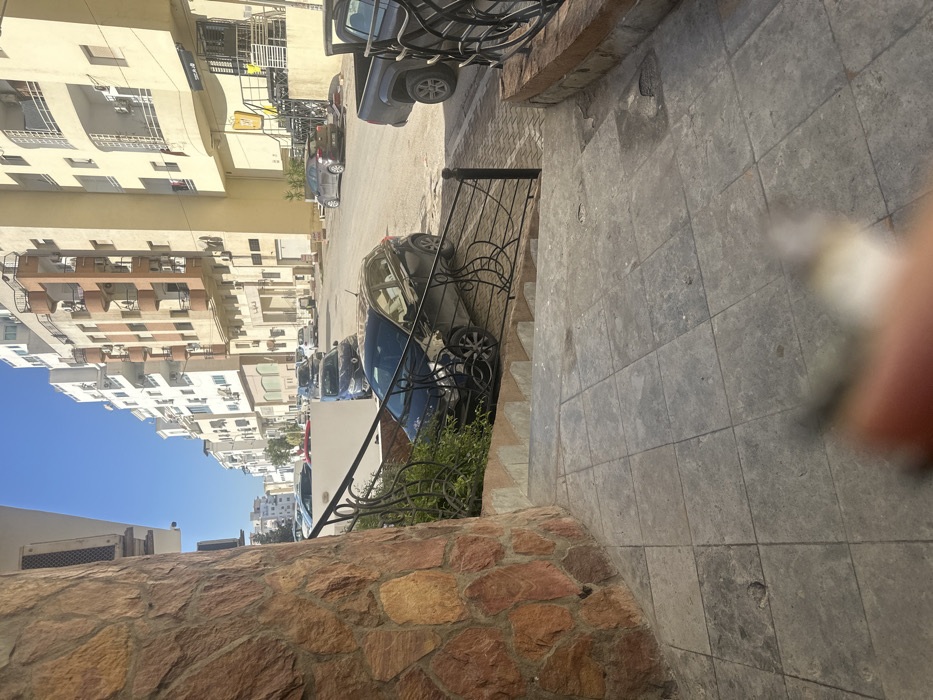 The image depicts an urban street scene in Ariana, Tunisia, observed from a slightly elevated position. In the foreground, a grey tiled pavement with minor wear extends across the bottom, partially obscured by a blurred, light-colored object held by fingers at the very bottom. To the left, a vertical structure clad in reddish-brown, irregularly shaped stone rises. A short flight of grey stone steps leads down, bordered by a black wrought iron railing with decorative scrollwork. Behind this railing, a small planted area with green foliage is visible. In the midground, a dark-colored hatchback vehicle, possibly black or dark grey, is parked facing away from the viewer, partially obscured by the railing and foliage. Beyond this, the street is visible, lined with multi-story buildings. On the left side of the street, buildings are predominantly white or light-colored, featuring multiple balconies with metal railings and numerous exterior air conditioning units. On the right side, buildings exhibit variations in color, including light yellow/beige and brown/tan, also equipped with balconies and visible air conditioning units. One building on the right features a storefront with a black sign bearing white text (partially illegible but resembling "SEAT") and a yellow sign below it. Further down, another building has a sign with Arabic script. The asphalt street surface shows some wear, with parked vehicles lining both sides. Notable vehicles include a black Renault Clio or similar hatchback on the left, a dark grey pickup truck (possibly a Volkswagen Amarok) parked on the right, and various other cars (sedans, hatchbacks) parked or in motion further down the street. The sky is clear blue, indicating sunny weather. No discernible human figures are present performing explicit actions within the visible frame.