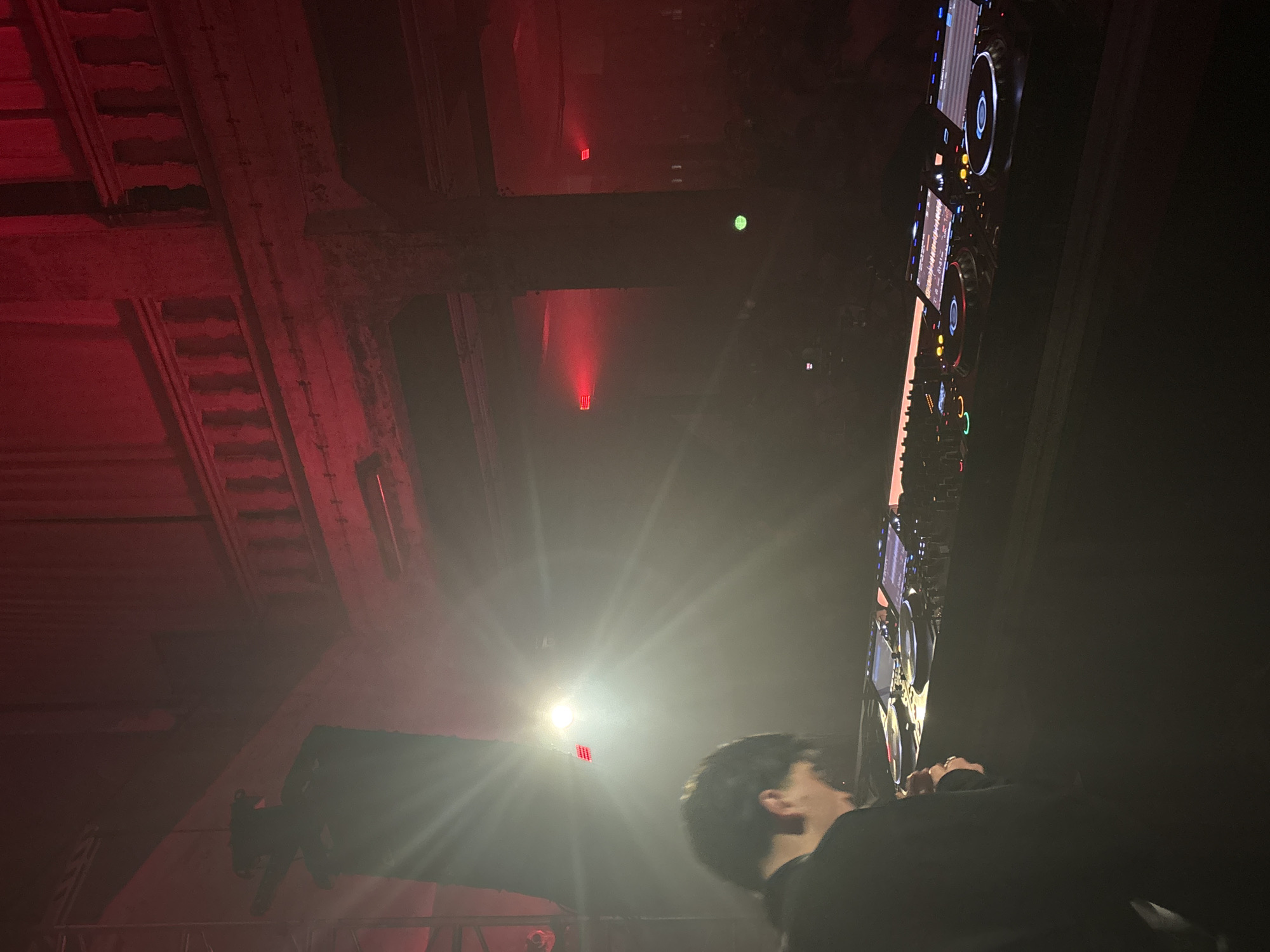 low-angle shot inside a dimly lit venue. A person is visible in the foreground, looking upwards towards a DJ console that is positioned on the right side of the frame. Above the person, there is a bright white light, which may be a spotlight. The ceiling is visible in the top left corner and features an industrial design with exposed beams and red lighting. The environment suggests a nightclub or concert hall setting. The city of Lisbon, Portugal, is not evident from the image.