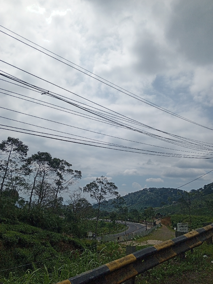 The image depicts a panoramic view of a mountainous landscape in Cisarua, Indonesia, under an overcast sky with patches of brighter cloud. Numerous dark electrical or communication lines extend horizontally across the upper third of the frame. In the foreground, a black and yellow striped metal guardrail runs across the lower right, partially obscured by tall green grass and weeds. A dark gray paved road with white edge markings curves sharply to the left in the midground, descending into the valley. A white low barrier or wall lines the outer edge of this curve. To the left of the road, a steep hillside is covered in dense green foliage and several tall, slender trees with sparse crowns. To the right of the road, near the curve, a white rectangular sign with black text, partially visible as "JELONG CILILIN," stands near an unpaved shoulder leading to further green terrain. The background consists of rolling hills densely covered in vibrant green vegetation, consistent with tea plantations, extending into the distant horizon. No individuals or vehicles are visible in the scene. The lighting suggests daytime under diffused light conditions due to cloud cover.