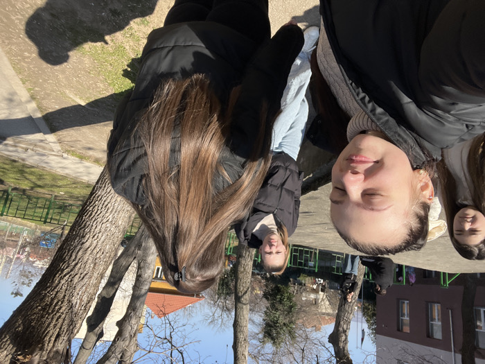 The image portrays an outdoor gathering under bright sunlight in Cherven Bryag, Bulgaria. The foreground features four young females. On the far left, a young female with dark hair and bangs, wearing a light-colored top, looks towards the center. Immediately to her right, another young female, appearing to take a selfie, has her eyes closed and a slight smile, with light brown hair pulled back, wearing a black puffer jacket over a light-colored ribbed turtleneck. To her right, a young female with long dark brown hair, secured by a black claw clip, stands with her back to the camera, wearing a black puffer jacket and dark trousers. To the right of the selfie-taker, facing the camera, is a young female with blonde hair tied back, dressed in a black puffer jacket over a light-colored turtleneck, light blue jeans, and white sneakers. The background reveals a multi-story building with a reddish-brown facade and multiple windows on the left, possibly a school or institutional building. Several individuals are visible in this area; one person is seated on a concrete structure, while others stand. A flagpole displaying a dark flag is positioned near this building. A large, bare-branched tree trunk is prominent in the mid-ground right. Further in the background, another building with an orange-tiled roof and yellow walls is partially visible through trees. The ground consists of concrete paths and patches of sparse grass and dirt. Strong shadows are cast across the scene, indicative of direct sunlight under a clear blue sky. Green metal railings are present in the mid-ground.