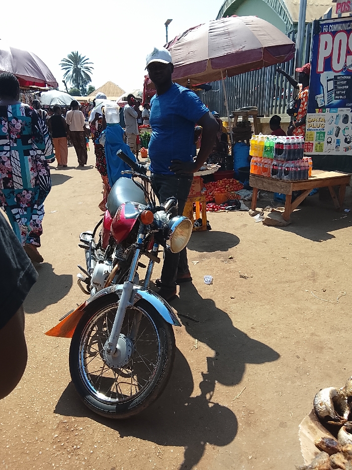 A motorcyclist wearing a blue shirt and white cap is standing next to his motorcycle parked in a bustling market. People mill about in the background among various vendors and stalls displaying colorful goods. Overhead are several market umbrellas and corrugated metal roofing. A sign for “FG Communications POS” is visible on the right. The ground is a mix of dirt and sand, casting long shadows from the bright sunlight. A basket of fish sits in the lower right corner.