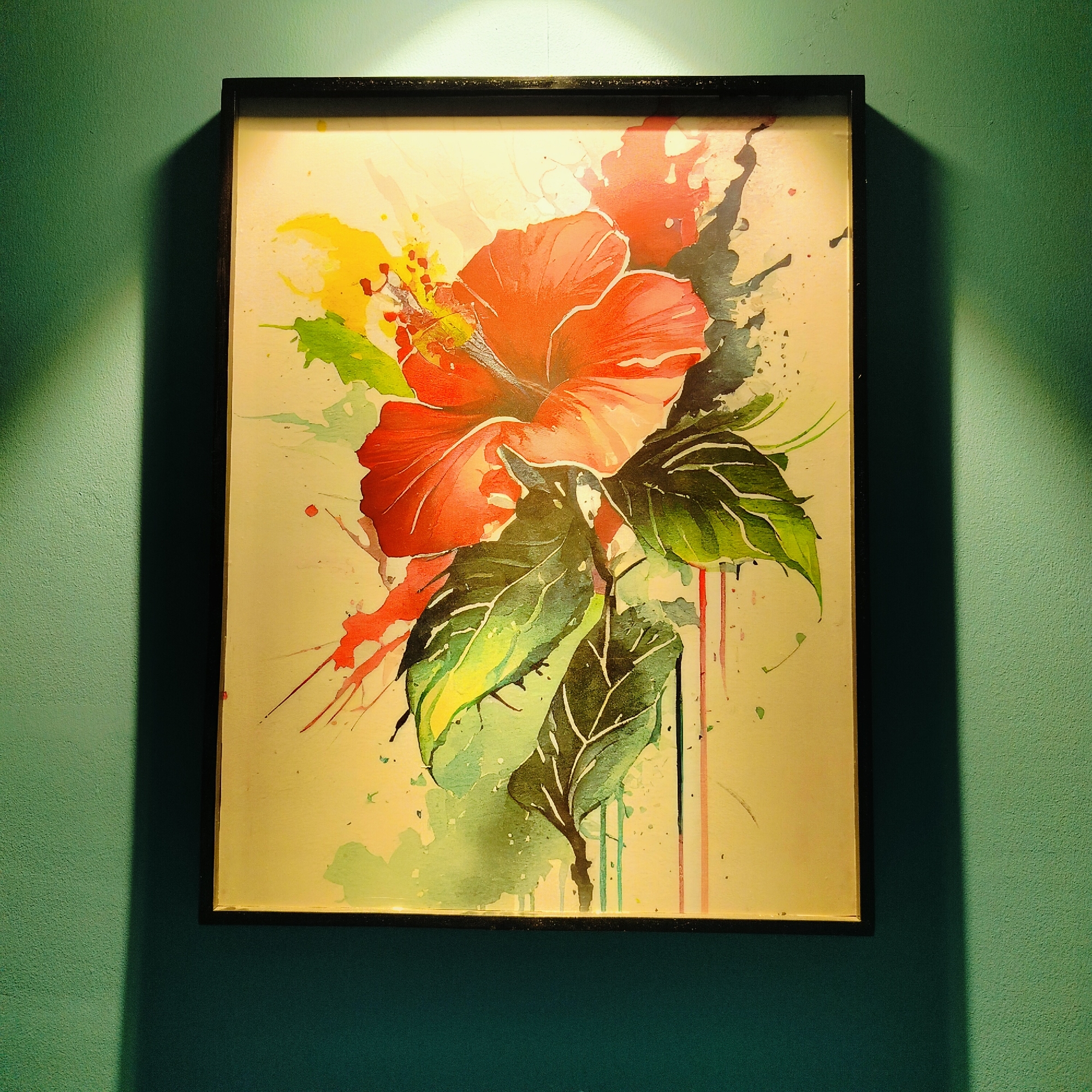 A framed watercolor painting hangs on a pale green wall. The painting depicts a red hibiscus flower with green leaves. Splatters of yellow, red, and gray paint accent the flower and foliage. The painting is illuminated by a light from above, casting a shadow on the wall. The city and location are unknown.