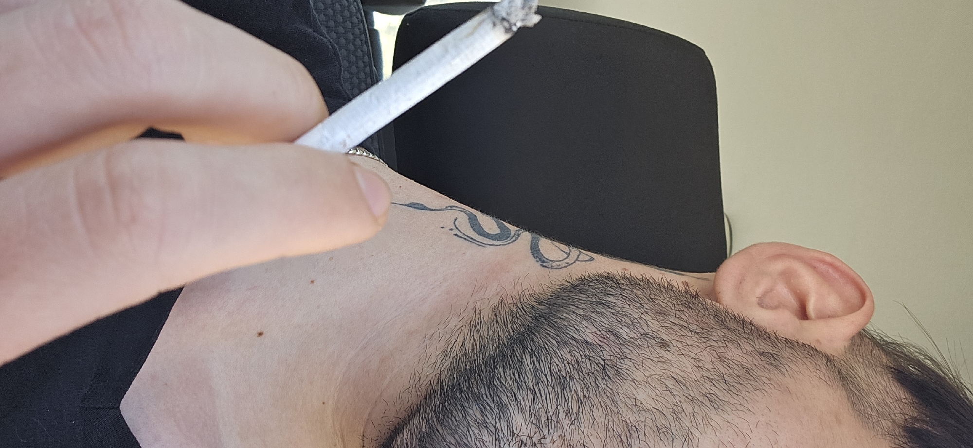 A close-up, indoor shot depicts a partially visible person with a lit cigarette between their fingers. The person has facial hair, and a tattoo is visible on their neck. The background includes a black headrest and a light-colored interior panel. The city of Momin Prohod, Bulgaria is not apparent within the image.