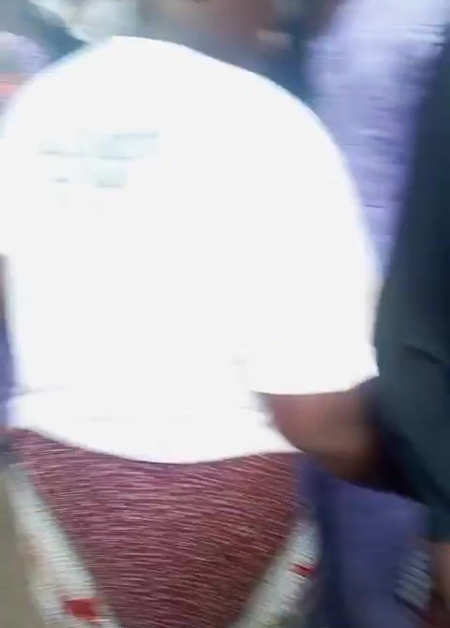 people dancing at what appears to be an outdoor gathering. The camera is focused on people in the foreground, with a larger group of people visible in the background. The dancers are wearing colorful outfits with traditional African prints. Overhead is a decorative ceiling with round cutouts. The ground is dirt or sand. The general mood is celebratory.