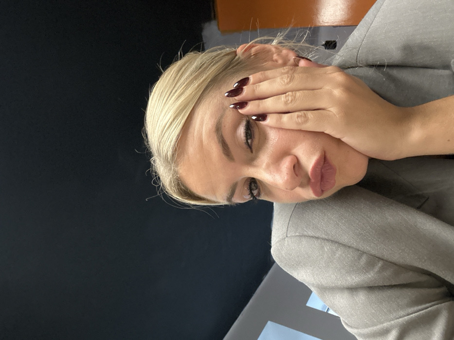A close-up, angled portrait depicts a single adult female in an indoor setting. The subject, positioned with her head slightly tilted, has blonde hair styled away from her face and wears a light gray textured blazer. Her left hand, featuring long, dark red almond-shaped nails, is placed against her left cheek and jawline. Her lips are pursed, forming an "o" shape, while her left eye is open and directed towards the camera; her right eye is partially closed. A small stud piercing is visible on her left nostril. The background features a dark blue/gray ceiling or upper wall section in the upper left, a partial light gray vertical structure on the far left, and a partial orange vertical surface on the far right. The image provides no visual cues to confirm a specific location within the city of Saint-Médard-en-Forez, France.