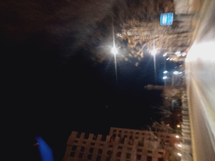 A nighttime shot features a dark body of water alongside a building illuminated with warm light. Street lights line the edge of the water and a road. A blue sign is visible atop a wall. The view is taken at a slightly high angle, looking down, with some motion blur evident on the right side.