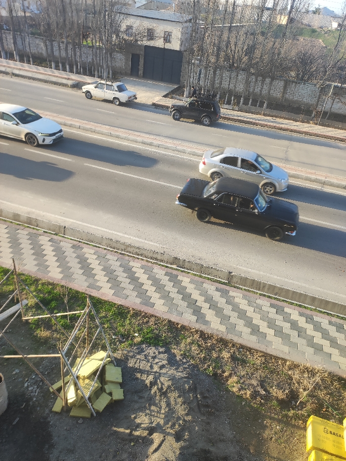 This is an elevated view of a multi-lane asphalt road in Jizzakh, Uzbekistan, depicting vehicular traffic and adjacent urban and construction elements under clear daylight. The road features two visible lanes for traffic moving from right to left across the frame. A white Kia K5 sedan occupies the left lane in the foreground, traveling from right to left. Parallel to it, a black GAZ-24 Volga sedan, with a driver visible, is in the right lane, also moving from right to left. Behind the black Volga, a silver Chevrolet Cobalt sedan is in the left lane, proceeding in the same direction. On the far right side of the road, a black Lada Niva SUV with a roof rack is parked on a dirt patch adjacent to the curb. Further back and to the left of the Lada Niva, a white Lada 210x series sedan is parked near a building. Parallel to the road in the bottom portion of the image, a paved sidewalk with a light and dark grey chevron pattern is visible. Adjacent to the sidewalk, in the lower left corner, is a dirt area containing construction materials. These include a stack of yellow rectangular insulation panels, some labeled "BASAL", and disassembled or partially assembled metal scaffolding components. Sparse green vegetation is present in this dirt area. In the background, beyond the parked vehicles, are several light-colored buildings, some with dark gates or doors. Numerous leafless deciduous trees line the roadside and a fence separates the road from the buildings. Distant hills or mountains are discernible on the horizon under a bright sky, indicating an outdoor, daytime scene. Shadows cast by vehicles and trees are distinct on the pavement.