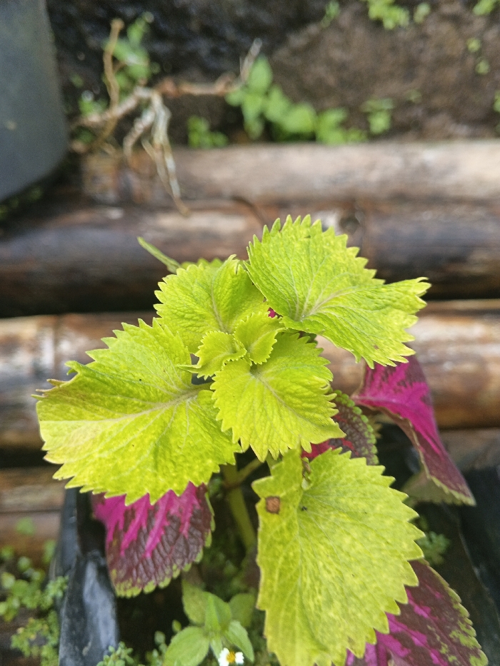 The image depicts a close-up, top-down view of a vibrant coleus plant, possibly located in Bien Hoa, Vietnam. The plant features numerous serrated leaves with striking variegation. The uppermost leaves are primarily a bright lime green or chartreuse, exhibiting a slightly crinkled texture. Beneath these, other leaves show distinct patterns of deep magenta or purplish-red, often bordered or streaked with green. The plant is situated within a dark, possibly black, container or grow bag, partially visible at the bottom of the frame. Small green ground cover and a single tiny white flower with a yellow center are present around the base of the coleus. The background is out of focus, showing multiple horizontal, weathered wooden logs or bamboo poles in shades of dark brown, with faint glimpses of additional green foliage and earthy tones behind them. No individuals or specific actions are depicted.