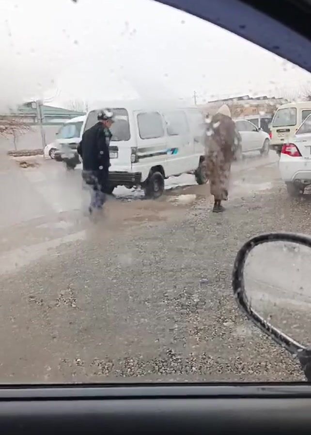The view from inside a car looking out at a gravel lot on a gray, wet day. Rain or sleet streaks the window. A white minivan is visible in the middle of the frame, slightly obscured by steam or smoke rising from its rear. Two individuals are walking near the van: a person in a dark coat and hat, and another in a long brown coat and a light-colored head covering. They appear to be walking away from the van, which is partially stuck in a puddle. Other parked cars are visible in the background, including a white sedan to the right. The car's side mirror is visible in the foreground.