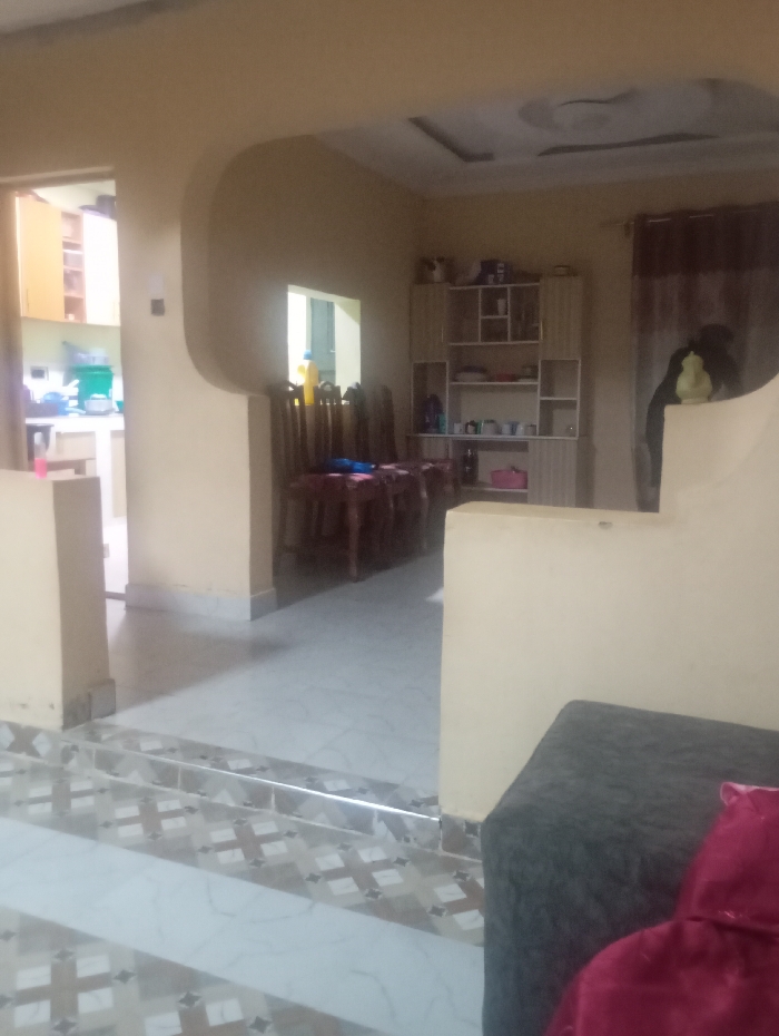 An interior shot shows a multi-room space. A kitchen is visible through a doorway. An archway leads to a dining area with wooden chairs and a table. Built-in shelves stand against a wall. Patterned curtains hang in a corner. The foreground includes a couch with a dark gray cushion and a red pillow. Tiled flooring with a checkered pattern transitions to plain white tiles. The walls are painted a muted yellow.