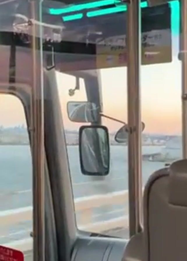 view from inside a bus. The bus is traveling over water, with land visible in the distance. The sky is dusky pink. The bus has a clear plastic partition in front of the driver's seat. A sign with Japanese and English text instructs passengers to keep their seatbelts fastened while the bus is in motion.