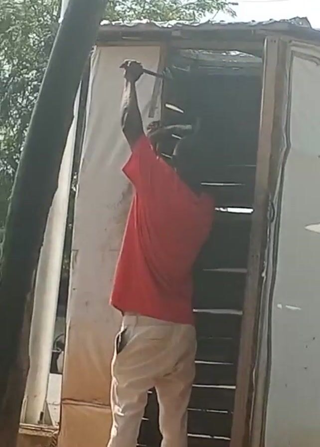 A man wearing a red t-shirt, tan pants, and sandals is standing in front of a small, white-sided structure that appears to be a makeshift outhouse. He is holding a metal bar in both hands above his head and striking the top of the structure. The structure has a wooden frame and appears to be covered with fabric or plastic sheeting. The man is facing away from the camera and toward the structure. A tree trunk is visible to the left of the frame. The ground appears to be dirt or sand.