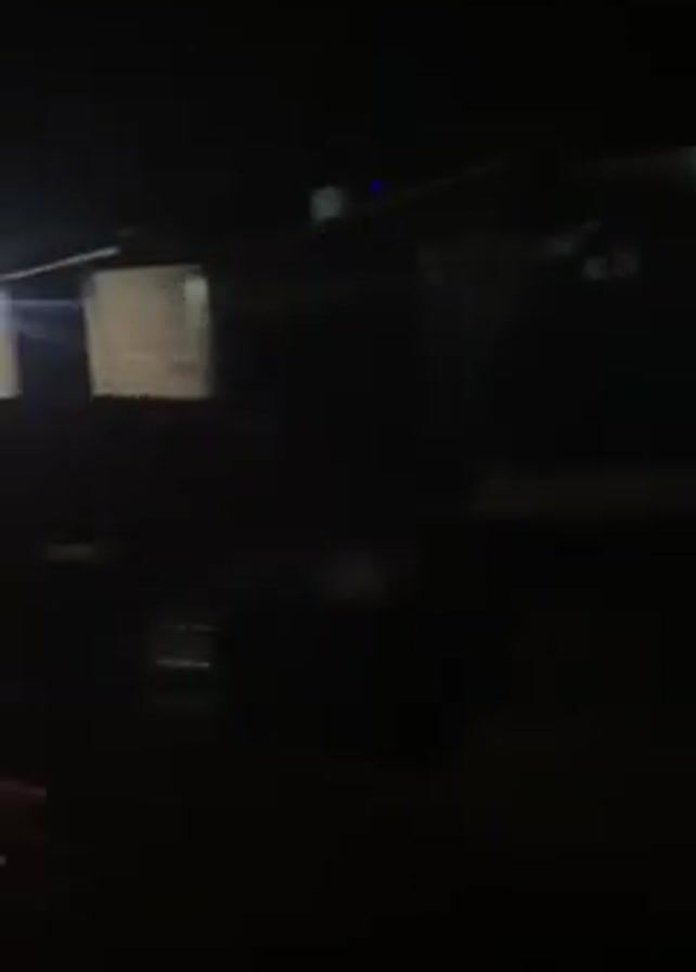 The video appears to be shot from inside a moving vehicle at night, possibly a car. The initial shot shows a building with lights strung up. The camera then pans to the left, showing a cement block structure with a table inside. The view becomes extremely dark, with occasional glimpses of light from street lamps or other sources.