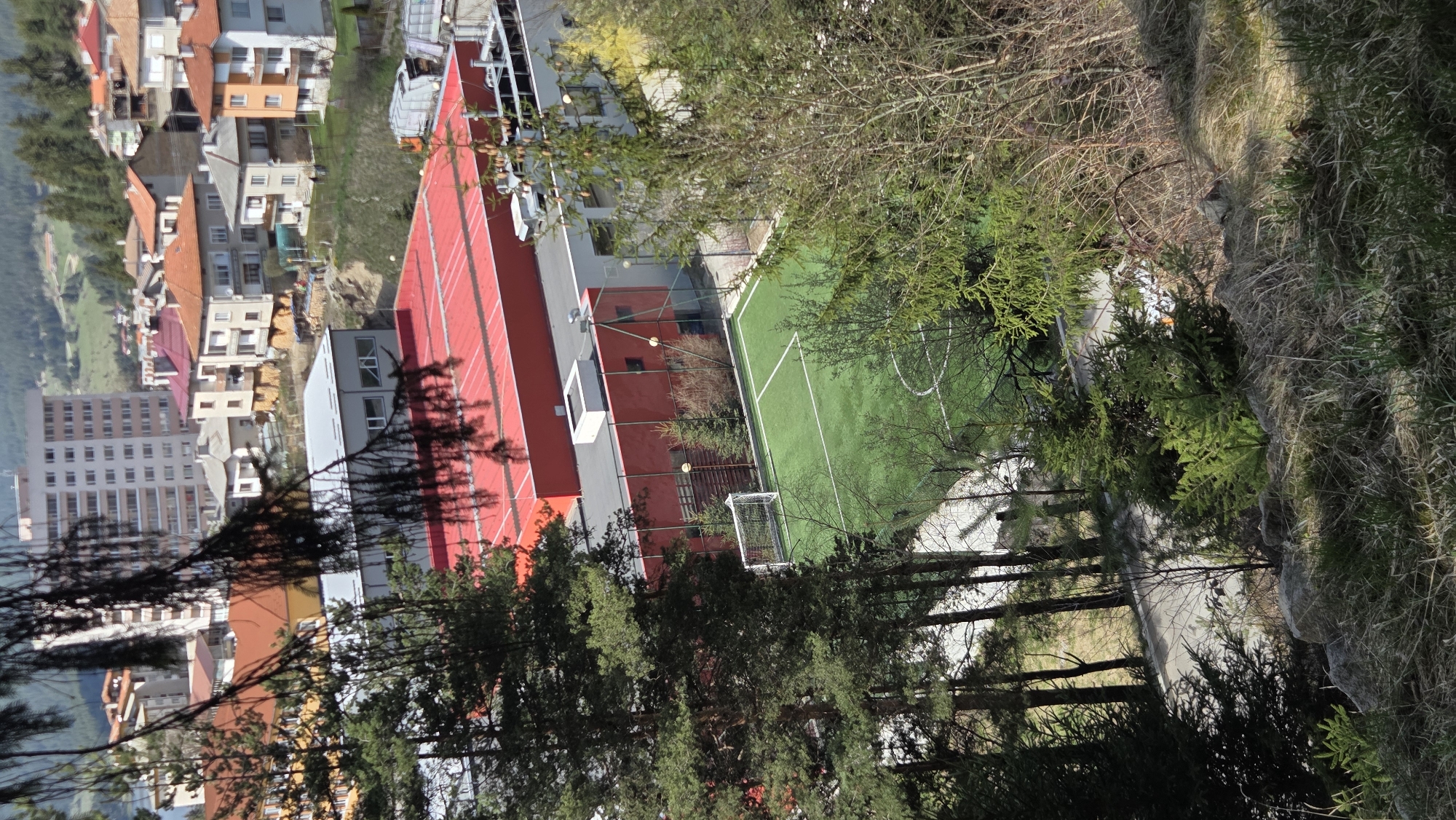 The image is an elevated view of a section of Dospat, Bulgaria, featuring a multi-purpose sports complex nestled among residential buildings. A predominantly red building with a gray section is visible, alongside a green artificial turf soccer field. A goal is present on one end of the field. A row of trees lines the lower portion of the frame, partially obscuring a path or road. The background reveals an array of buildings, some with orange roofs and others being taller apartment blocks. Vegetation, including grassy slopes and trees, surrounds the developed area.