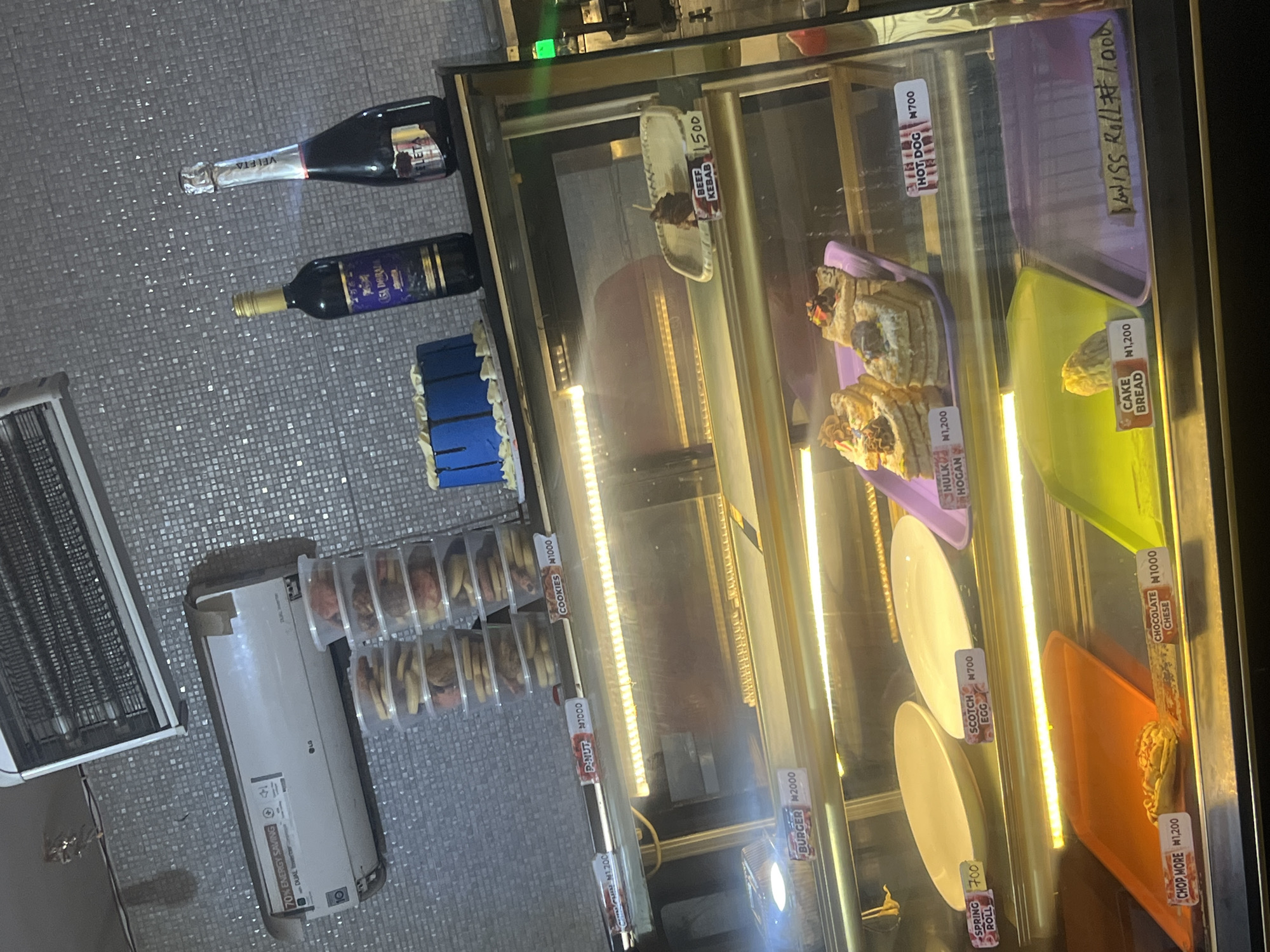 This image shows a refrigerated display case in a shop in Jos, Nigeria. The case contains various food items, with price tags in Nigerian Naira (N). The top shelf has: - A beef kebab (N1,500) - Hot dogs (N700) - A Swiss roll (N1,000) The middle shelf displays: - Hulk Hogan cakes (N1,200) - Cake bread (N1,200) - Scotch eggs (N700) The bottom shelf contains: - Burgers (N2,000) - Spring rolls (N700) - Chop more (N1,200) Next to the display case are: - Cookies (N1,000) - P-nuts (N1,000) - A stack of blue-iced cakes. - Bottles of wine (a Veleta bottle) An LG air conditioner unit is also visible on the left side.