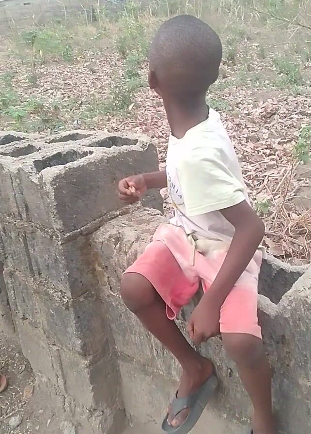 two children outdoors. Both are Black, and barefoot except for sandals. One child is wearing a light-colored T-shirt and plaid pants, and the other child is wearing a light-colored T-shirt and pink shorts. They are near concrete blocks. One child reaches up and touches the other child's head.