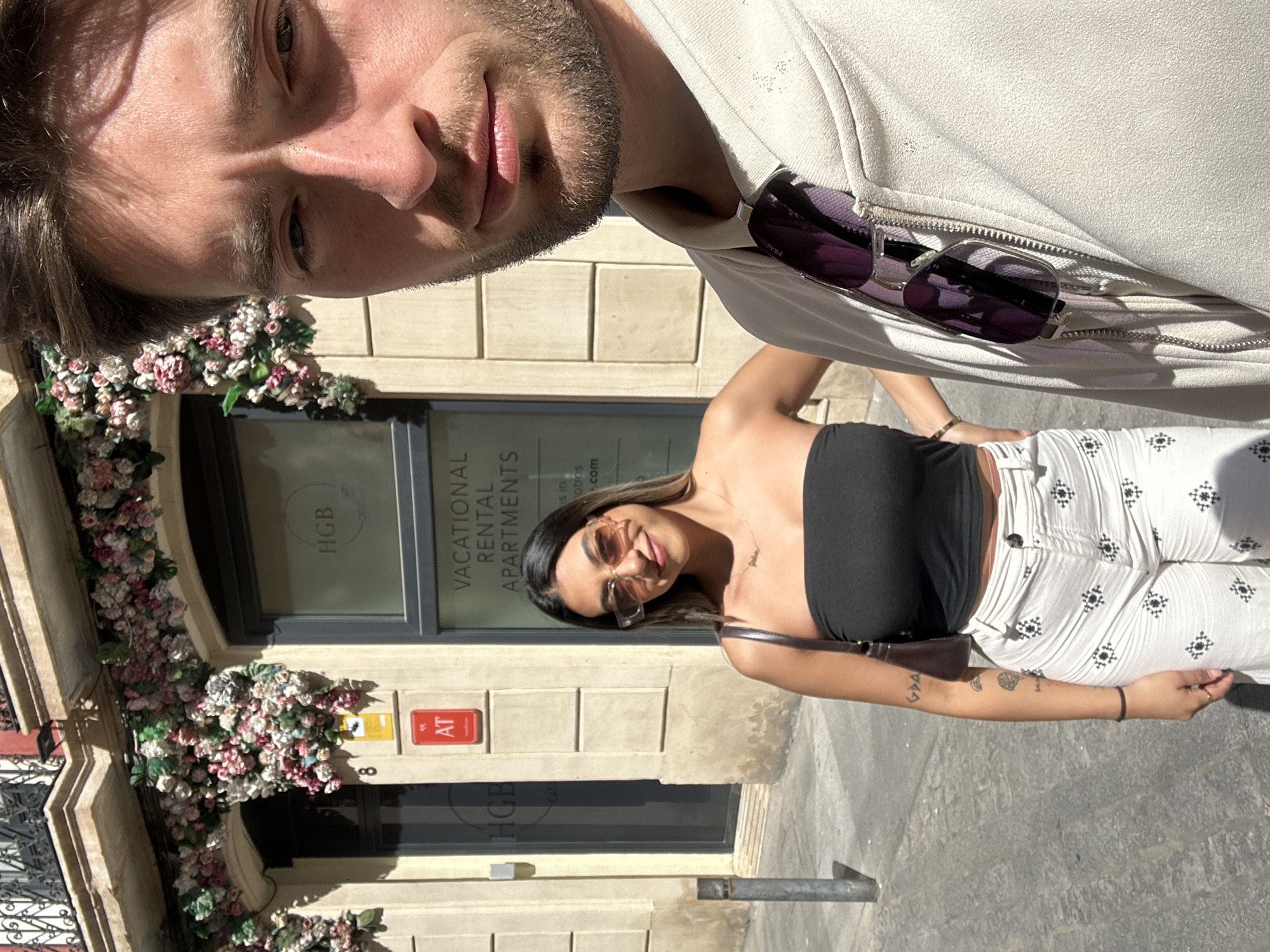 The scene depicts two individuals, a male and a female, standing outdoors on Calle San Telmo, 8, in Alicante/Alacant, Spain. The setting is a paved street alongside a light-colored building facade identified as "HGB VACATIONAL RENTAL APARTMENTS," marked with a red "AT" sign (Apartamentos Turísticos) and the number "8" on the wall. Artificial floral garlands adorn the arches above a dark door and a window on the building. The male occupies the right foreground, with his upper right torso and face visible. He has short brown hair and light stubble, wearing a light beige or off-white zippered jacket. Dark-lensed sunglasses are clipped to his jacket zipper, bearing a partial "PRADA" inscription on the strap. His expression is neutral, and his gaze is directed towards the camera. The female stands in the midground, slightly to the left of the male. She is facing the camera with a subtle smile, wearing light-framed sunglasses, a black strapless tube top, and white trousers with a recurring black geometric pattern. A dark brown shoulder bag is slung over her left shoulder. Visible on her left forearm are several tattoos, including a "G>A" symbol, a brain-like image, and text reading "SALUD." She wears a delicate gold-colored necklace. The scene is brightly lit by natural sunlight, casting clear shadows. A metal bollard is visible on the left side of the paved street.