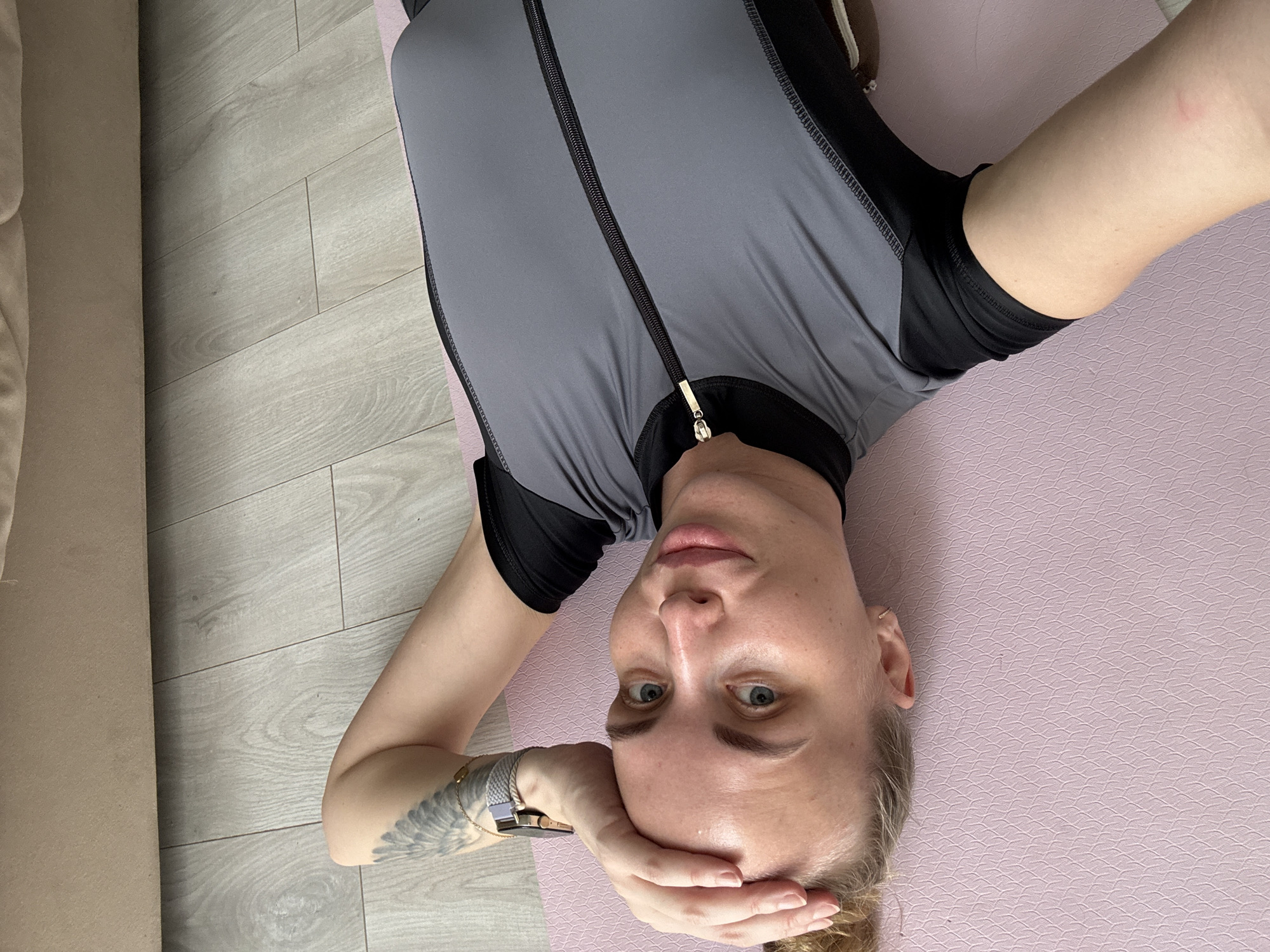 The image depicts a female individual lying supine on a pink, textured exercise mat in an indoor setting. The specific location in Sirius, Russia, is not visually verifiable from the image content. The subject has fair skin, blue eyes, and light-colored hair, partially pulled back. She is wearing a grey and black short-sleeved athletic top with a black central zipper featuring a gold-colored pull. A smartwatch with a grey woven band and rose gold-colored casing, along with a thin gold-colored chain bracelet, is visible on her left wrist. A wing-themed tattoo is present on her upper right arm. Her left hand rests on her head. She is looking directly at the camera. The flooring consists of light wood-look laminate panels. A section of a light-colored upholstered object is visible in the upper background. A small red mark is present on the visible portion of her right thigh.