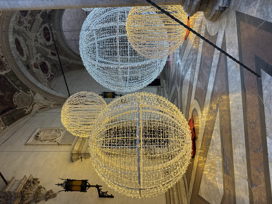 Four illuminated spheres hang from the ceiling of a building with historical architecture. The largest sphere is gold colored while the one in the upper middle is white. A painted, domed ceiling is visible in the upper left. An ornamental stone carving sits on the wall, and a black metal lantern fixture extends from the wall below and to the left of the lower left sphere. The floor has a pattern of gray and tan marble.
