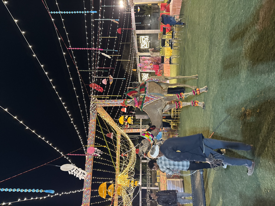 A nighttime outdoor event features a decorated camel as a central attraction. Strings of lights crisscross overhead, and a decorative archway is adorned with lights and colorful elements. People gather around the camel, and seating arrangements are visible in the background. The scene is illuminated, creating a festive and lively atmosphere.