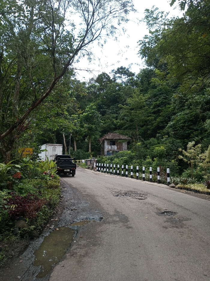 The image displays a rural road in Ariyalai, Sri Lanka, winding through a densely vegetated, hilly landscape. The asphalt road surface shows wear, including multiple potholes and a muddy puddle on the left edge. A dark-colored pickup truck is parked on the left shoulder, facing away from the viewer, positioned near a white rectangular cargo container and partially visible yellow signage. On the right side of the road, a bridge barrier composed of regularly spaced black and white painted bollards runs parallel to the road, with small potted plants arranged along its base. Beyond the bridge, a small, dilapidated building with a reddish-brown tiled roof and weathered walls is situated amidst thick foliage on the rising terrain. The dominant environment is a lush, green forest canopy, extending up the hillsides under an overcast sky. No individuals are visible, and no actions or interactions are occurring.