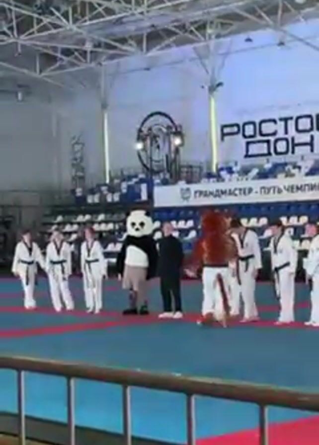 group of people, mostly wearing white martial arts uniforms, standing in rows on a blue and red mat in a large indoor arena. There is a man in a black suit, a panda mascot, and a tiger mascot standing in the center of the group. The background includes stadium seating and banners with text in Russian. Overhead, there is a large display screen and lighting rigs. The video is taken from behind a blue metal railing. The overall environment suggests a sports competition or event. The people are standing at attention. There is clapping in the background.