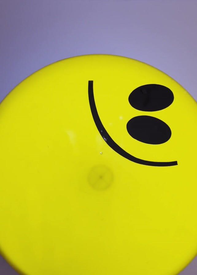A yellow balloon with a black marker-drawn winking smiley face turns into a sad face when someone rotates it