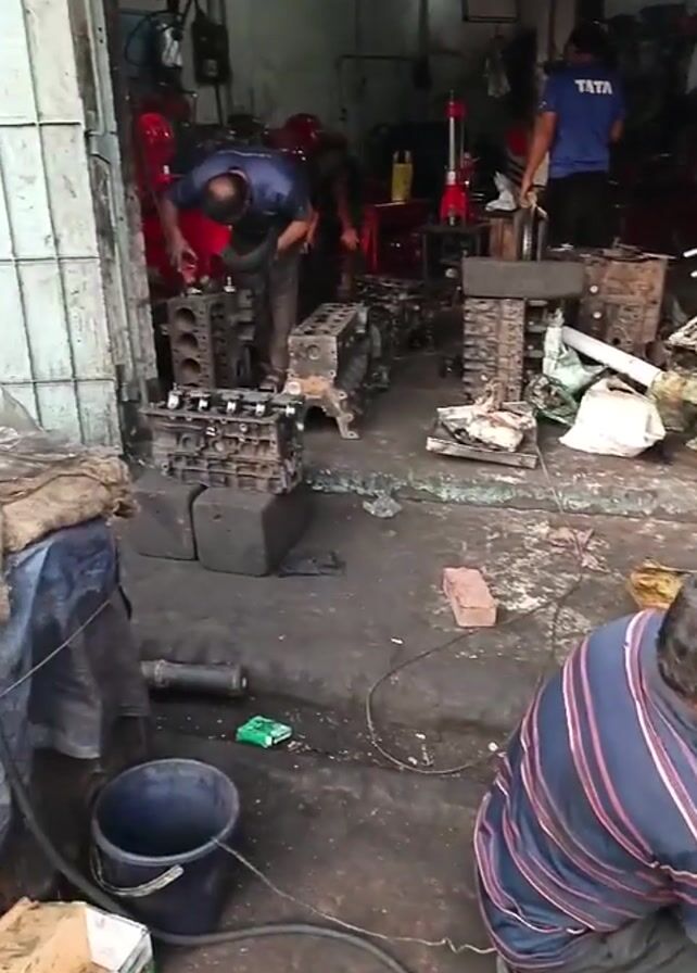 interior of an automobile repair shop. Two men work on an engine block in the foreground. Another man inspects a second engine block further back in the shop, using a flashlight to illuminate the interior. The shop is cluttered with tools, machinery, and multiple engine blocks in various states of repair. The floor is stained and oily. The entrance to the shop is a large metal grid door. The overall impression is of a busy, functional workspace dedicated to engine repair.