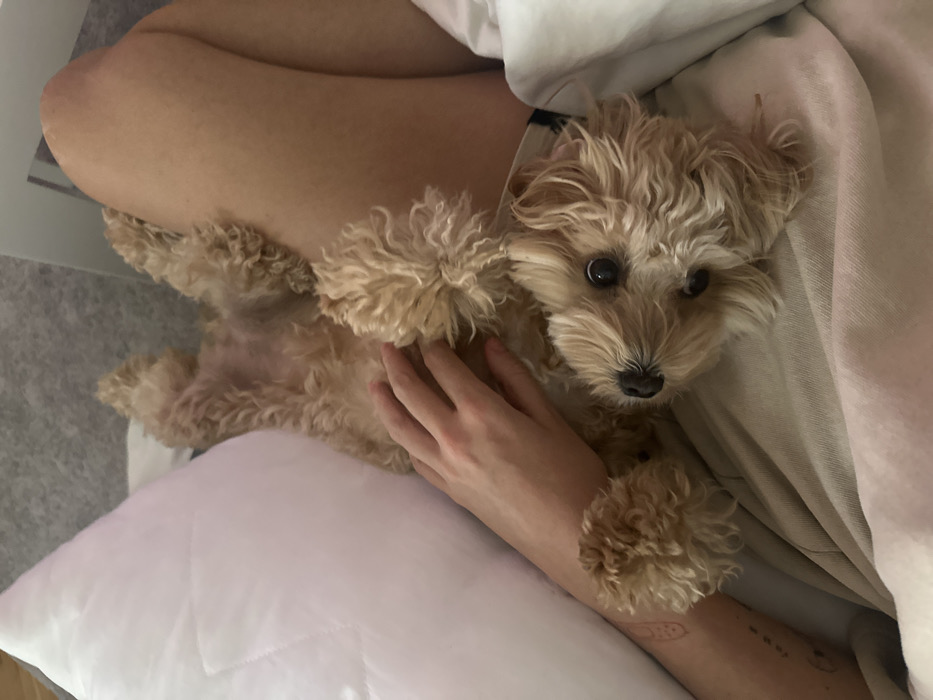 The scene depicts an indoor environment, specifically a bedroom, located within the Palilula Urban Municipality, Serbia. A light-skinned human's lower left arm and upper legs are visible. The arm, featuring a faint, light-colored tattoo on the inner forearm, is positioned to the left of the frame. The hand is touching the belly area of a small, light-brown, curly-haired dog. The dog is lying on its back with all four paws extended upwards, resting between the human's left arm and legs. Its head is turned towards the camera, with dark eyes and a dark nose visible. The human's upper legs are visible on the right side of the frame. The dog's belly shows lighter fur. The human is covered by light-colored bedding, likely a sheet or duvet. A white pillow is visible on the upper left, and a light gray headboard or wall is in the background.