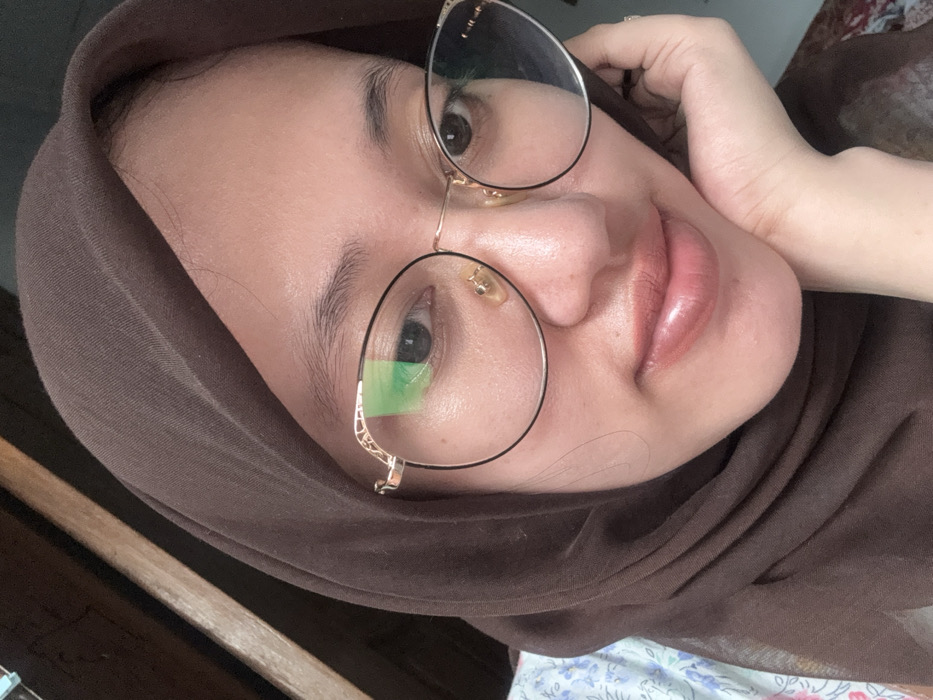 A close-up portrait depicts a female individual, located in Gadingrejo, Indonesia. She is wearing a brown hijab that covers her head and neck, and a light-colored top with a subtle floral or abstract pattern is visible on her left side. The individual wears black-framed eyeglasses with gold-toned details on the bridge and temples; a distinct green reflection is present in the left lens. Her left hand supports her chin, with fingers gently curled. She exhibits a light-to-medium skin tone, natural eyebrows, and lips coated with a light pink, glossy cosmetic. Her expression is neutral with a subtle upward curve of the mouth, and her gaze is directed towards the viewer. The background is out of focus, revealing dark horizontal wooden slats in the upper left and a section of patterned fabric, predominantly light blue and white, in the lower left portion of the frame.