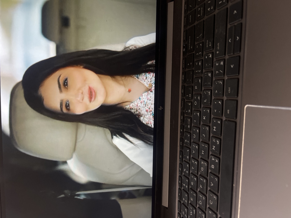 The image displays an HP laptop, dark gray in color, with its screen showing a video. The laptop's keyboard, featuring both Arabic and Latin characters, and a section of its silver-gray palm rest are visible in the lower portion of the frame. The video depicts a young adult female with long dark hair, a light complexion, and noticeable makeup including eyeliner and lipstick. She is wearing a white collared shirt layered over a floral patterned top and a thin gold chain necklace with a small red heart pendant. She is seated within what appears to be a vehicle interior, as indicated by light-colored (cream or beige) car seats visible behind her. Her expression is a slight smile, and her gaze is directed slightly off-camera to her left. The environment outside the vehicle, visible through a window, is blurred. The specific location of Nuseirat, Palestinian Territory, cannot be determined from the visual information provided in this image.