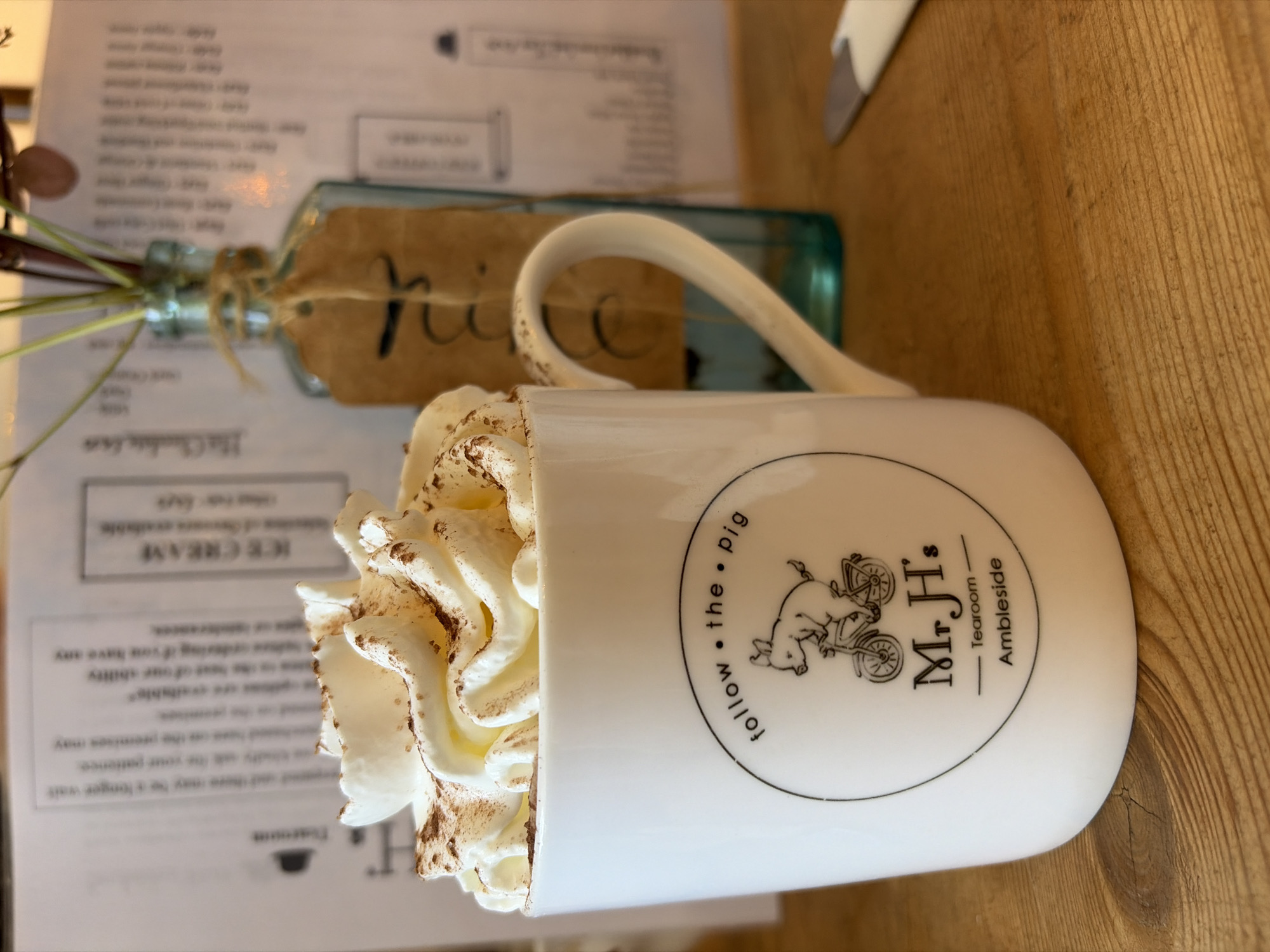 The image displays a close-up, high-angle view of a white ceramic mug containing a beverage topped with whipped cream and sprinkled cocoa powder, resting on a light-colored wooden table. The mug features a black circular logo with the text "follow • the • pig" and an illustration of a pig riding a bicycle. Below the illustration, the logo reads "Mr. H's Tearoom Ambleside," identifying the location as Ambleside, United Kingdom. In the blurred background, several white sheets of paper with black printed text are visible, resembling menus or informational signage. To the right of the mug, a teal-colored glass bottle, possibly functioning as a small vase, is present. It has a light brown paper tag attached to its neck with twine, and several green plant stems are inserted into it. A small portion of a utensil, appearing to be a knife with a silver blade and white handle, is visible on the table surface in the far right of the frame. The wooden table exhibits prominent grain patterns. No individuals are depicted in the scene.