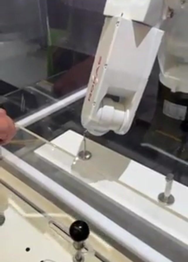 A person's hand is holding a thin, white rod near a white robotic arm labeled “ROKAE” inside a glass enclosure