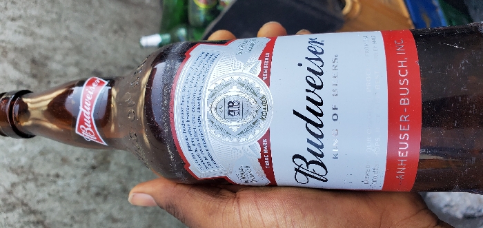 - "An upright brown glass Budweiser beer bottle is held by a dark-skinned hand from the left side" by FM-JwA7r1, licensed under CC BY 4.0