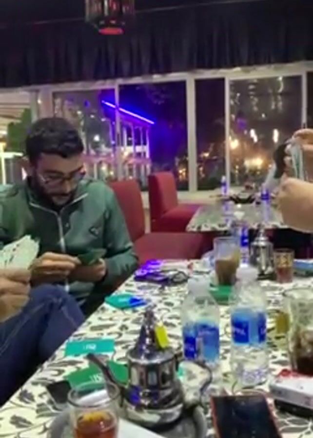 A group of people are sitting around a table playing cards in a cafe. One man in a green jacket and glasses is focused on his hand of cards. A teapot, glasses of tea, water bottles, and other items are on the table. The cafe has large windows looking out onto a brightly lit area, with red chairs and decorative lighting inside.