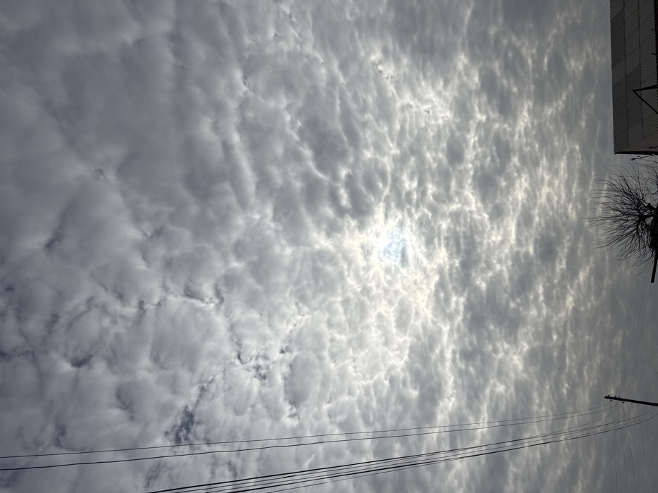 A vast expanse of altocumulus clouds covers the sky, partially obscuring the sun. The cloud formations are textured and appear as layered, rippled patterns. In the lower part of the frame, electrical wires stretch across. Along the right edge, a building overhang and bare tree branches are visible against the cloudy backdrop. The overall tone is overcast and muted.
