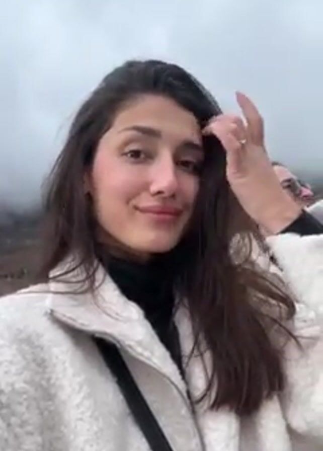 woman holding a smartphone and filming herself while standing outdoors. She has long brown hair and is wearing a white jacket and a black turtleneck sweater. A black strap from a bag or purse is slung across her body. Behind her, a man is taking photos with his phone. He is wearing sunglasses, a beige vest and a red and white plaid shirt. In the background there is a stone building that appears to be in ruins, set against a cloudy sky. The environment appears to be hilly or mountainous. The woman smiles at the camera.