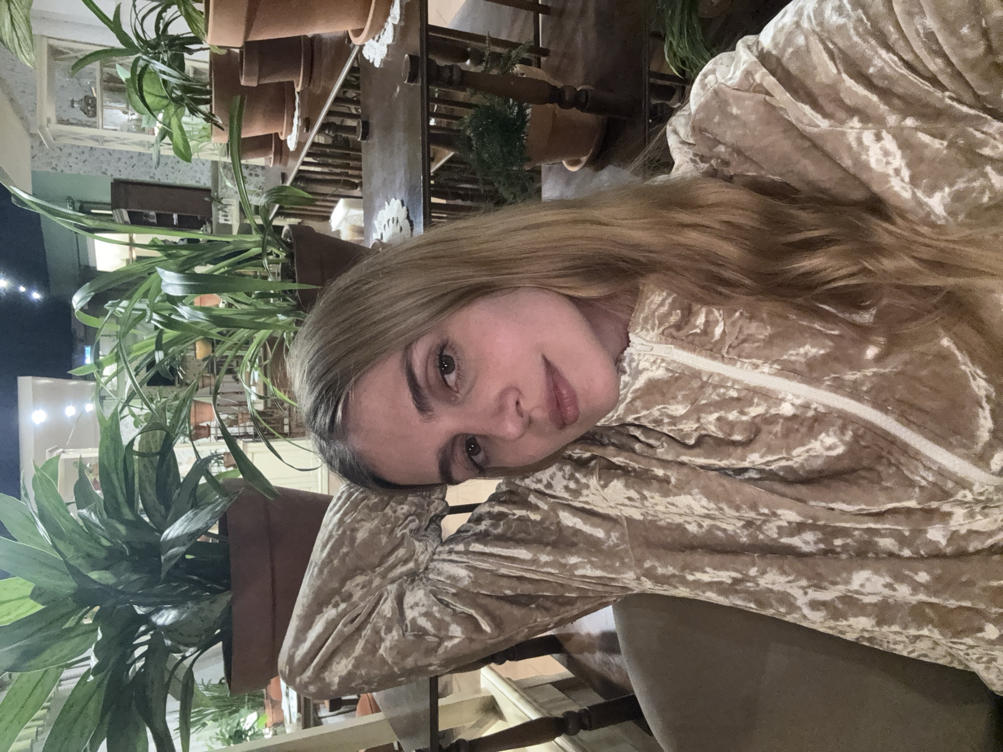 A young woman with blonde hair, dressed in a golden-beige velvet jacket, is photographed at a close angle, lying with her head resting on her arm. Her gaze is directed towards the camera. The background features a mix of plants in terracotta pots, a wooden railing, and glimpses of a room interior. The plants are predominantly green, suggesting indoor foliage. The indoor environment has a slightly aged or vintage aesthetic. There is no explicit evidence to confirm the location is Yekaterinburg, Russia, or any specifics about the city within the image. The scene focuses predominantly on the woman and the indoor ambiance.
